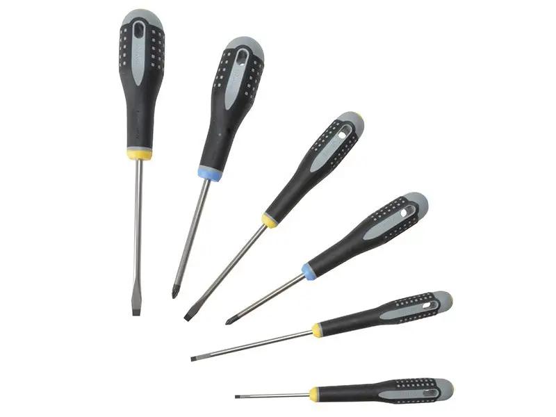 Bahco BE-9882 ERGO™ Screwdriver Set 6 Piece with an ergonomically developed 3-component handle of polypropylene and thermoplastic elastomere. There are permanent colour codes at both ends of the handle as a time saving aid for application identification.