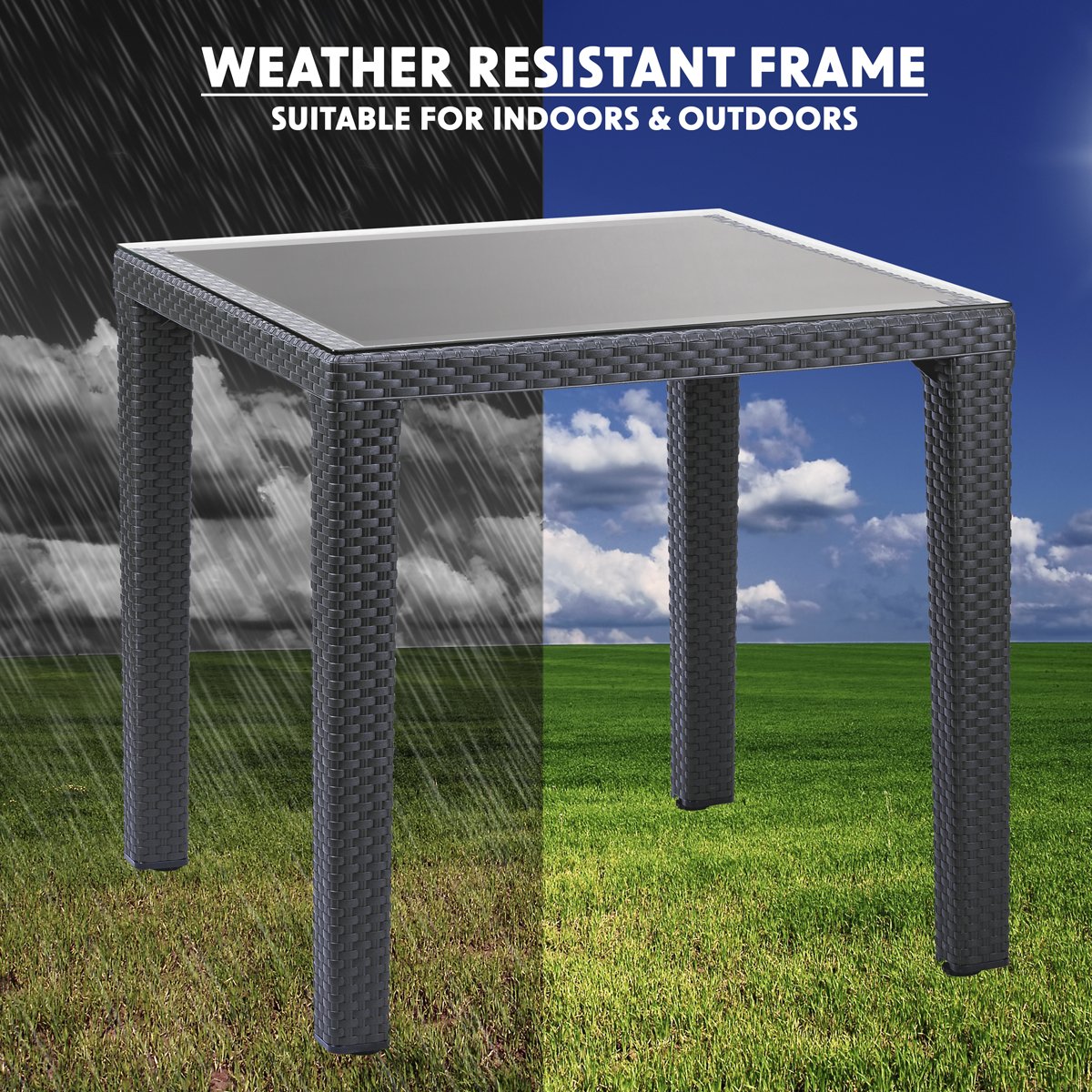 This beautiful plastic and glass table is made from high-quality Polypropylene/Fibreglass, giving it a polished, modern finish. With a strong and sturdy body, this heavy-duty table can be a permanent fixture in your garden. The PP/Fibreglass blend is far stronger than cheaper alternatives, and the metal struts provide additional strength. The anthracite grey finish is stylish and UV-resistant, ensuring the colour lasts. It's suitable for use in the rain as well as the sun, so you don't have to let the weather stop you from making the most of your furniture! This table is easy-to-clean, simply wipe with a damp cloth to get it looking as good as new. Suitable for both indoor and outdoor use, and can cater for a wide variety of occasions and applications. It also features adjustable feet for levelling, making it ideal for various terrains. Dimensions (W x D x H) - 800 x 800 x 760mm.